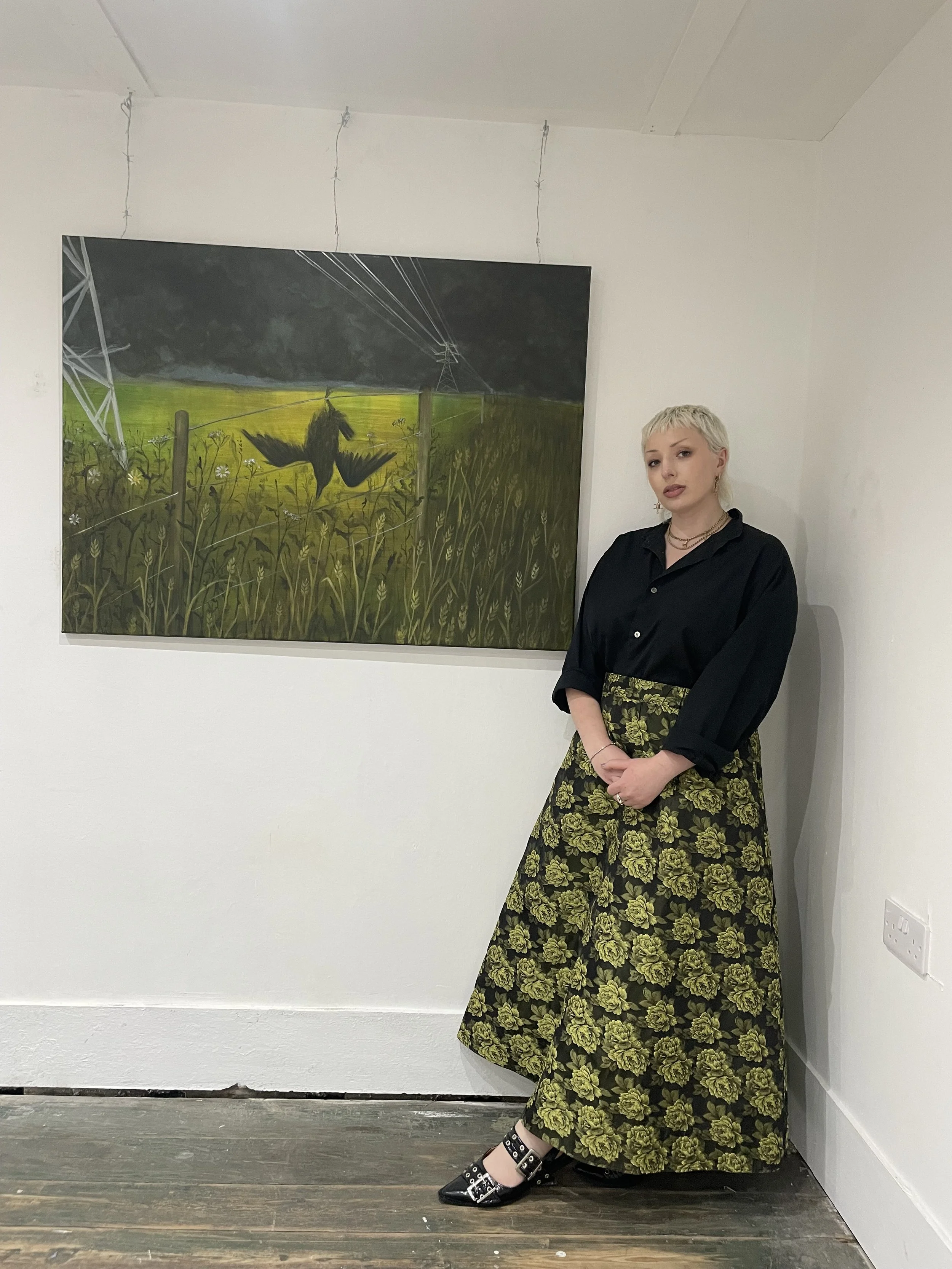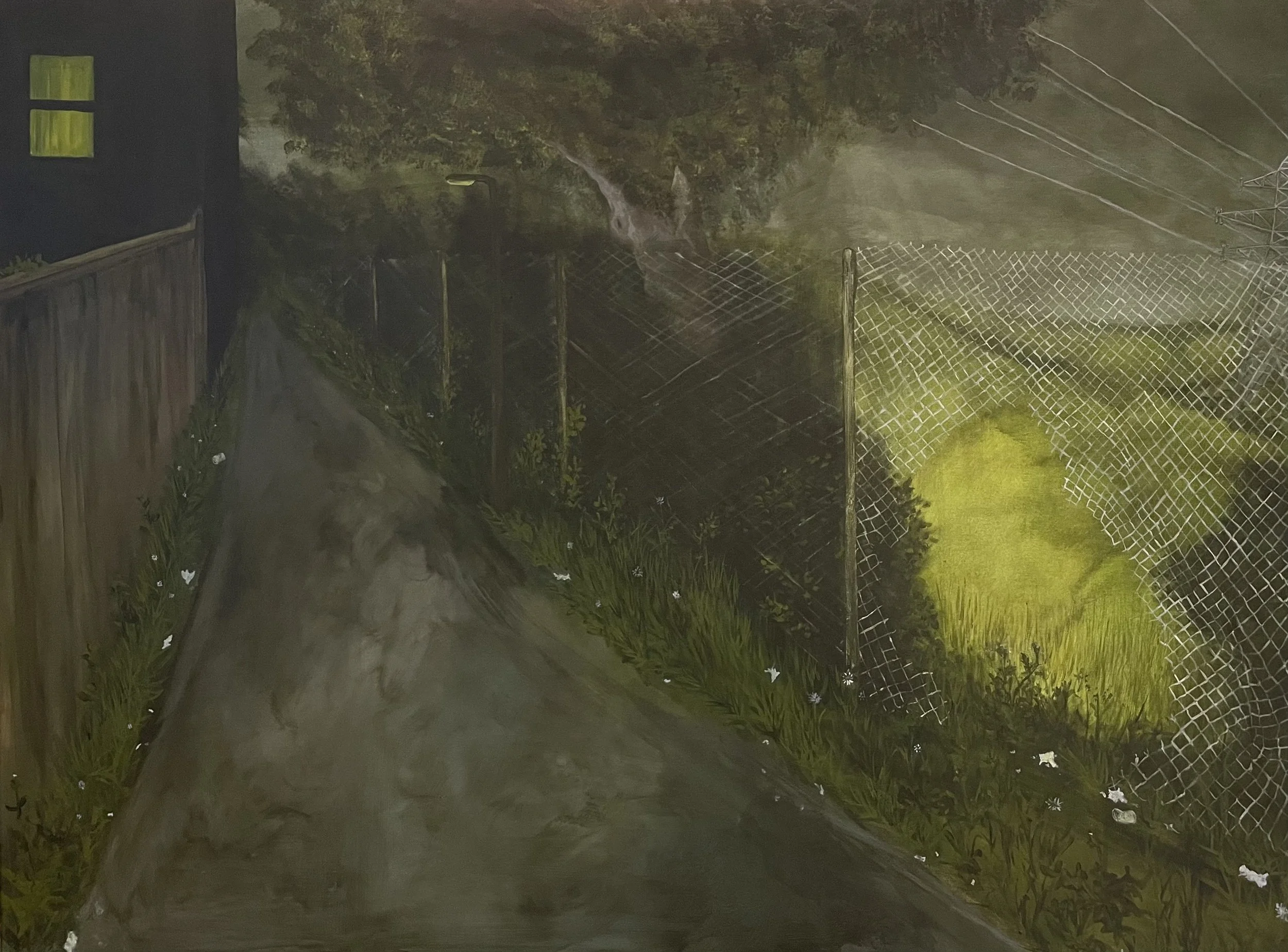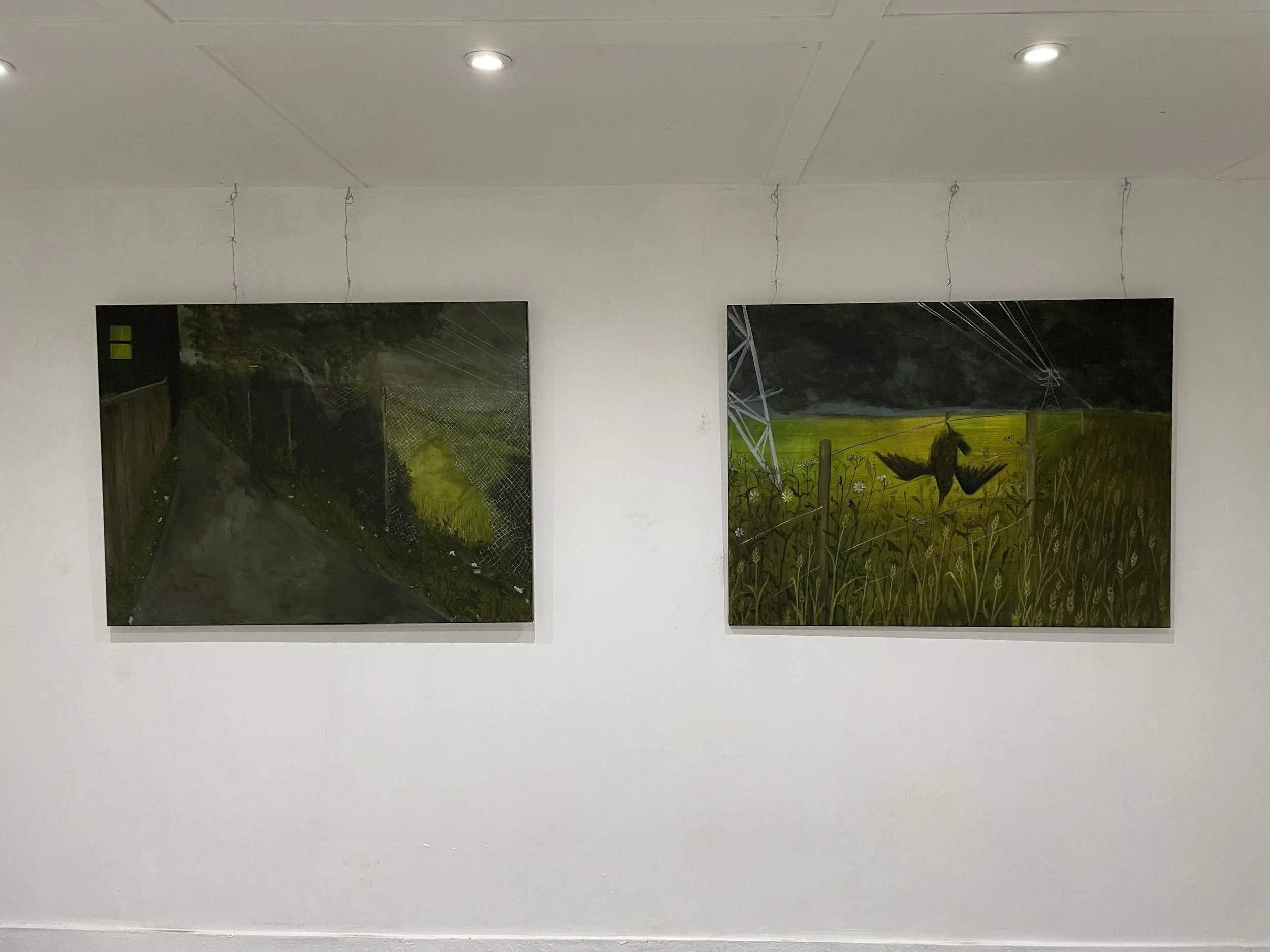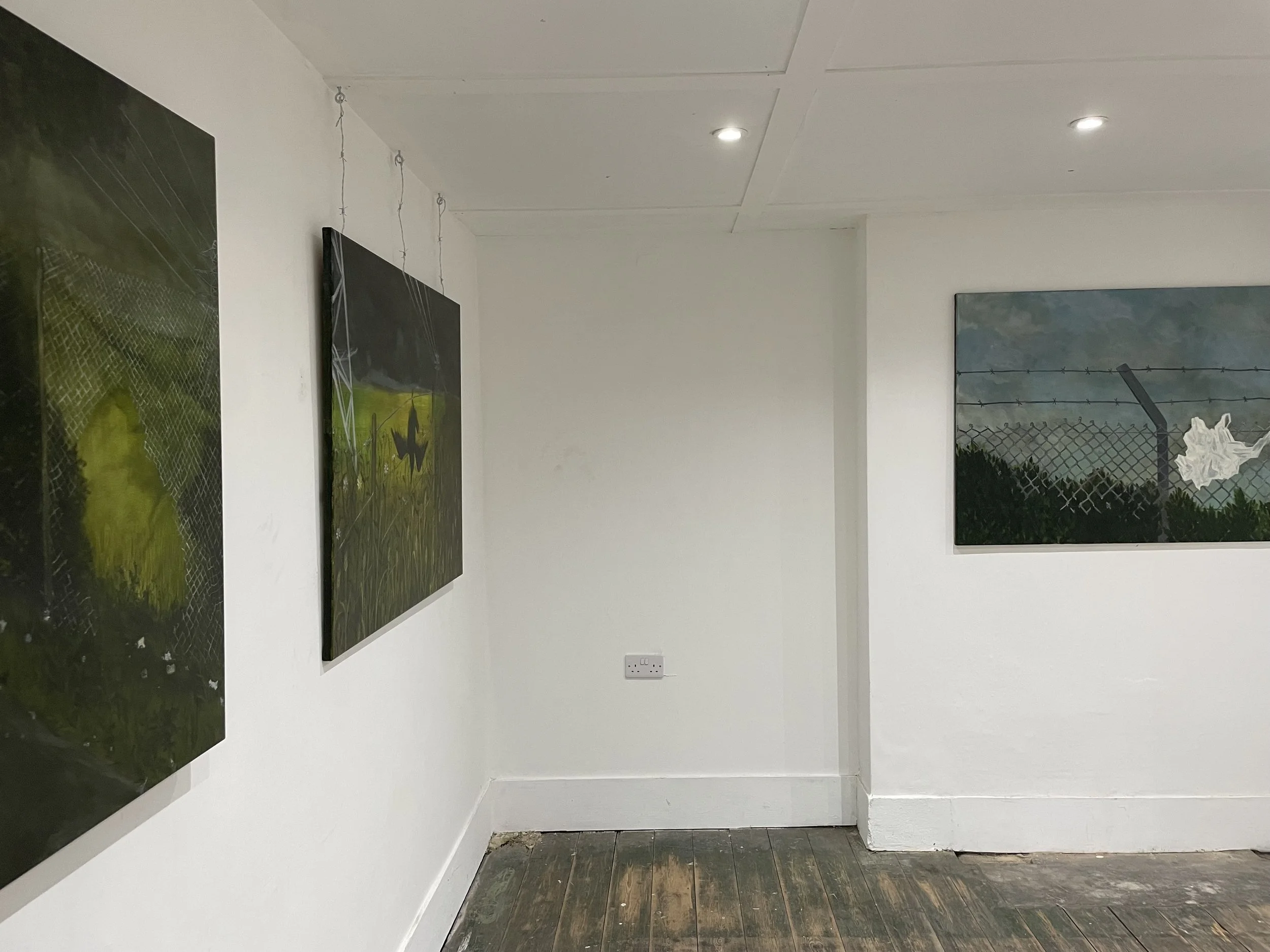 Emily North’s work evokes the experience of growing up in a small post industrial town and being haunted by memory. Using images of edge-lands and liminal spaces, her work explores how ideas of place and belonging are interwoven with the ghosts of personal and historical pasts. Working between her hometown of Barnsley and London, North finds herself noticing the ghosts of both towns in the empty, in-between spaces, untied to either place. Through painting, drawing, and mixed-media artworks, Crawling Home on Bloody Knees is an exploration of what it means to belong in a place unsure of its own present.
