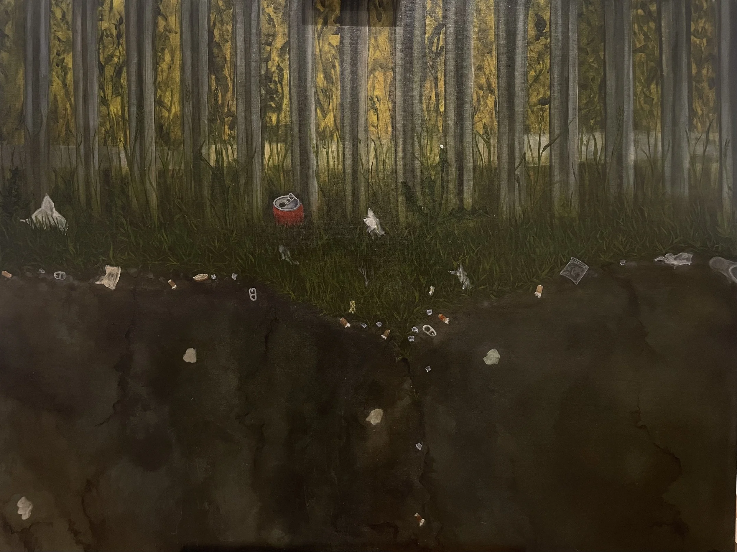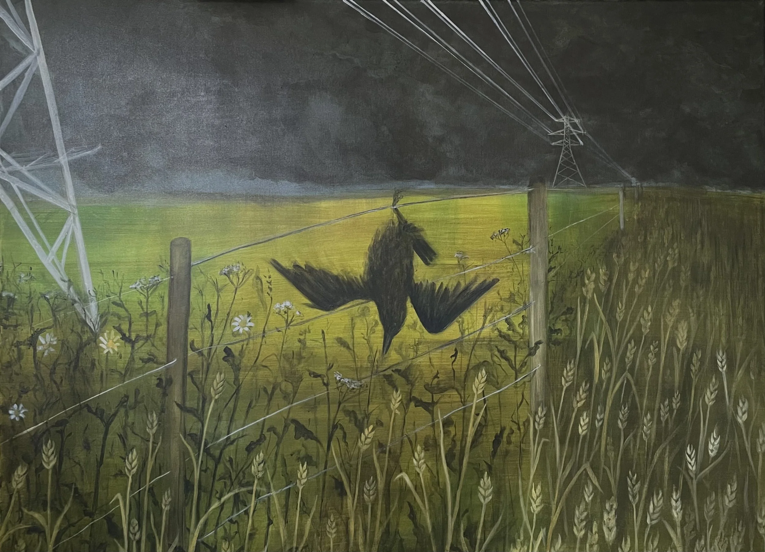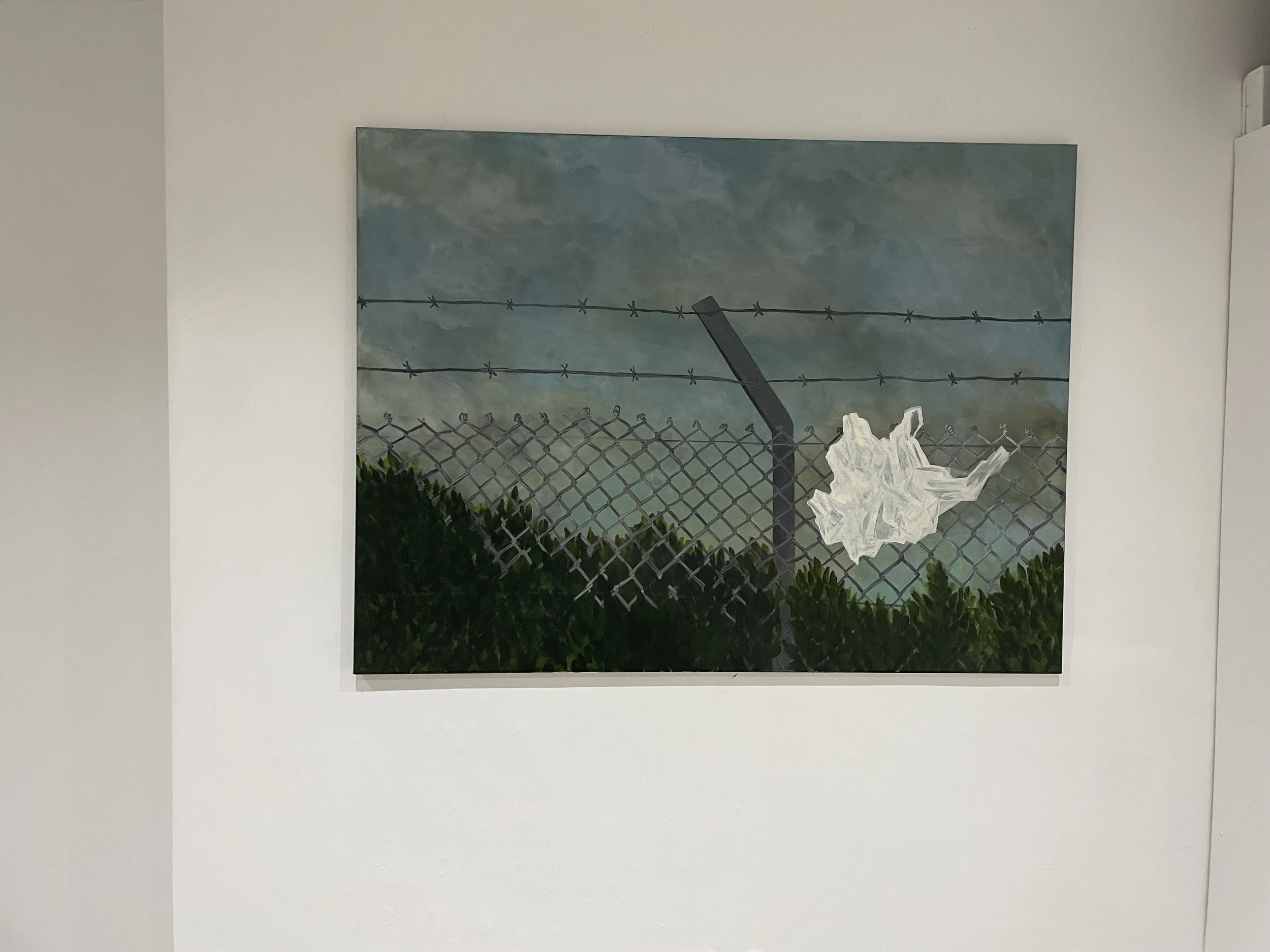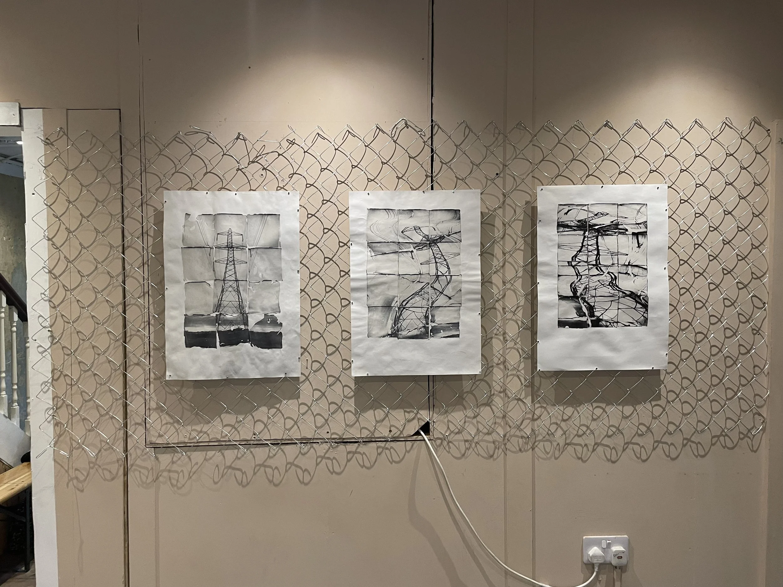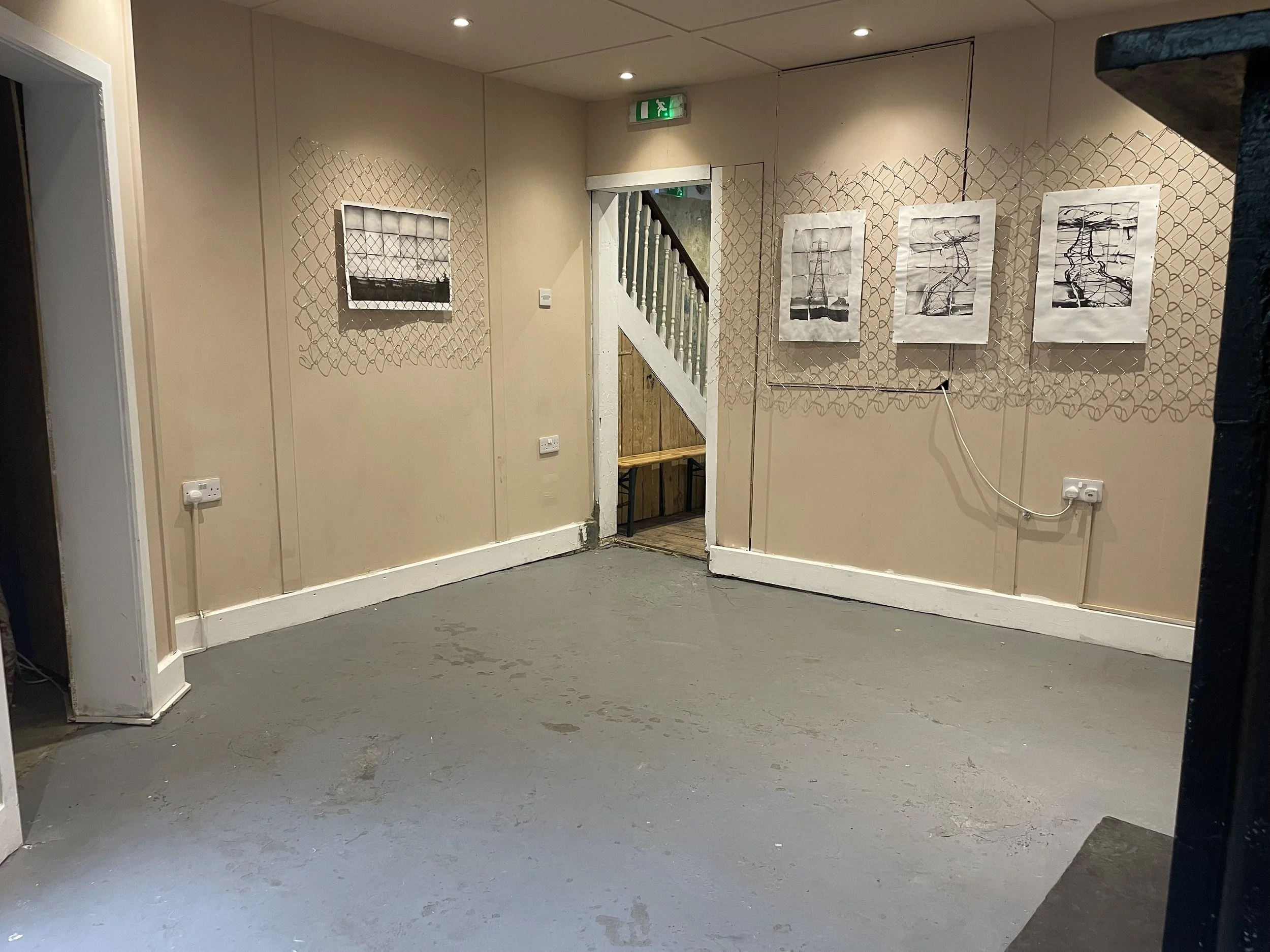 Emily North’s work evokes the experience of growing up in a small post industrial town and being haunted by memory. Using images of edge-lands and liminal spaces, her work explores how ideas of place and belonging are interwoven with the ghosts of personal and historical pasts. Working between her hometown of Barnsley and London, North finds herself noticing the ghosts of both towns in the empty, in-between spaces, untied to either place. Through painting, drawing, and mixed-media artworks, Crawling Home on Bloody Knees is an exploration of what it means to belong in a place unsure of its own present.